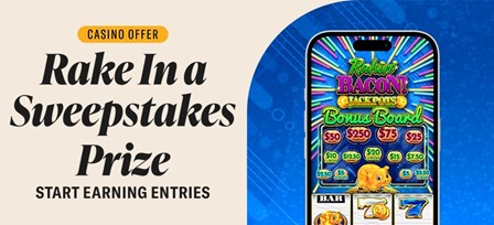 Enter the $20K Rakin’ Bacon Jackpots Bonus Board Sweepstakes. Two lucky winners will each take home a $10,000 Casino Bonus!